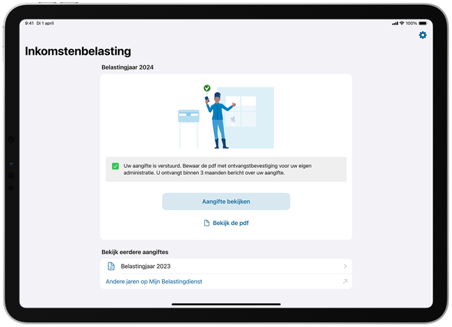 Wilt u later in de aangifte-app nog eens checken of wij uw aangifte hebben ontvangen? Log dan in op de app. Als wij uw aangifte hebben ontvangen, ziet u meteen op het scherm 'Inkomstenbelasting' de melding 'Uw aangifte is verstuurd. Bewaar de pdf met ontvangstbevestiging voor uw eigen administratie. U ontvangt binnen 3 maanden bericht over uw aangifte'.