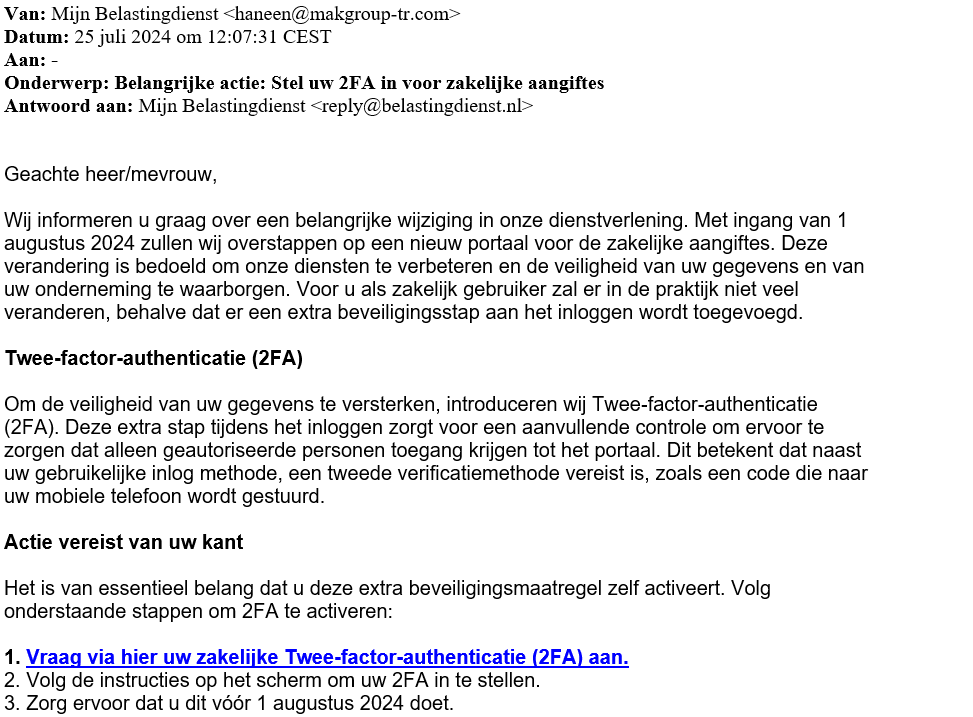 Momenteel is er een valse e-mail in omloop die afkomstig lijkt van de Belastingdienst. In deze mail staat dat u Twee-factor-authenticatie (2FA) moet aanvragen, zodat u veilig een nieuw portaal voor zakelijke aangiftes kunt gebruiken. Daarvoor moet u in de e-mail klikken op de link 'Vraag via hier uw zakelijke Twee-factor-authenticatie (2FA) aan'.