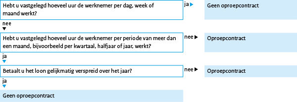 Er is geen sprake van een oproepcontract als u met uw werknemer meerdere arbeidsomvangen met vast aantal uren per dag, week, 4 weken of maand hebt afgesproken. Denk bijvoorbeeld aan een arbeidsovereenkomst waarin staat dat de werknemer in de wintermaanden 36 uur per week werkt en in de zomermaanden 28 uur per week.